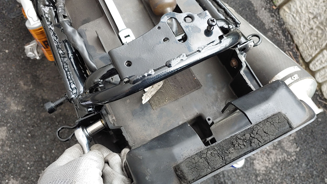 문제는, 볼트를 2개, 1개 넣어줘야 우측 스텝 프레임이 리어쇽에 간섭되지 않는다.